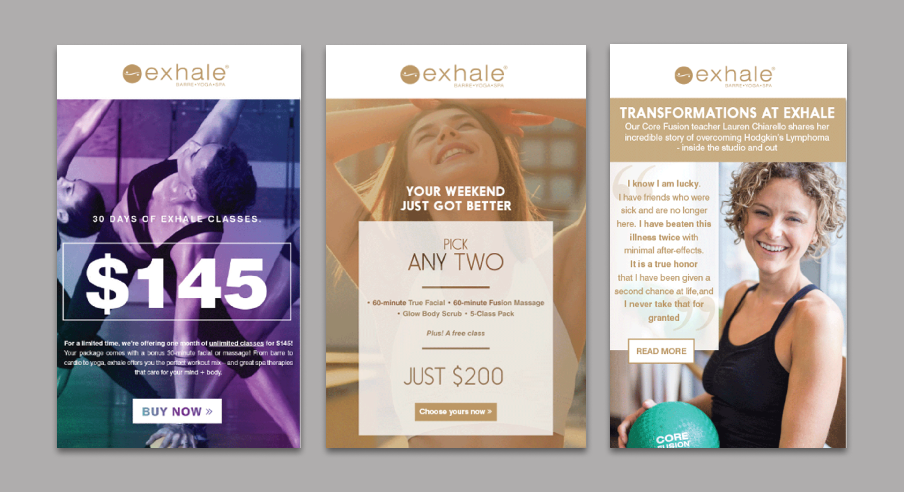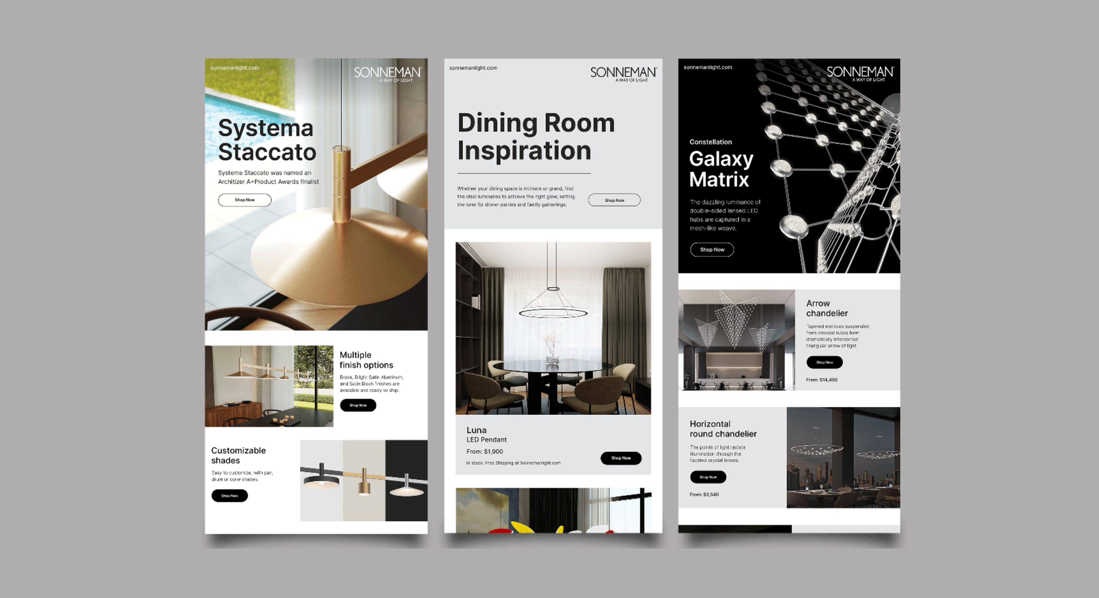During my time as an in-house graphic designer at Sonneman: A Way of Light and Exhale Spa, I had the opportunity to work on a variety of email campaigns aimed at engaging and informing our customer base. These emails ranged from product launches and special promotions to event invitations and seasonal updates. I was responsible for designing visually compelling, on-brand layouts that not only captured attention but also encouraged customer interaction. By crafting emails that were both aesthetically appealing and functional, I played a key role in driving customer engagement and increasing brand awareness for both companies.